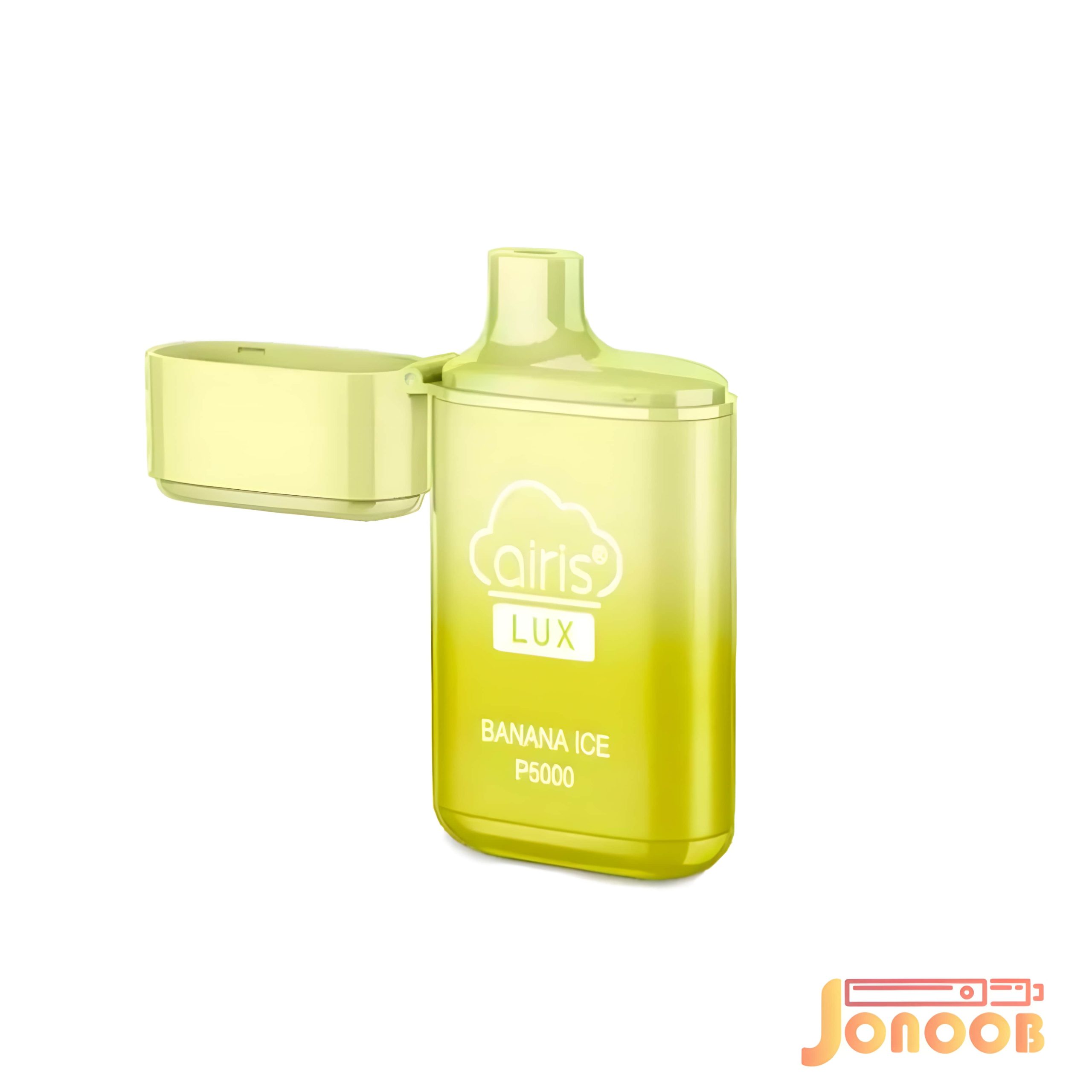 پاد یکبار مصرف AIRIS LUX P5000 BANANA ICE دارای باتری 650 میلی آمپر قابل شارژ و درپوش محافظتی آنتی باکتریال است .