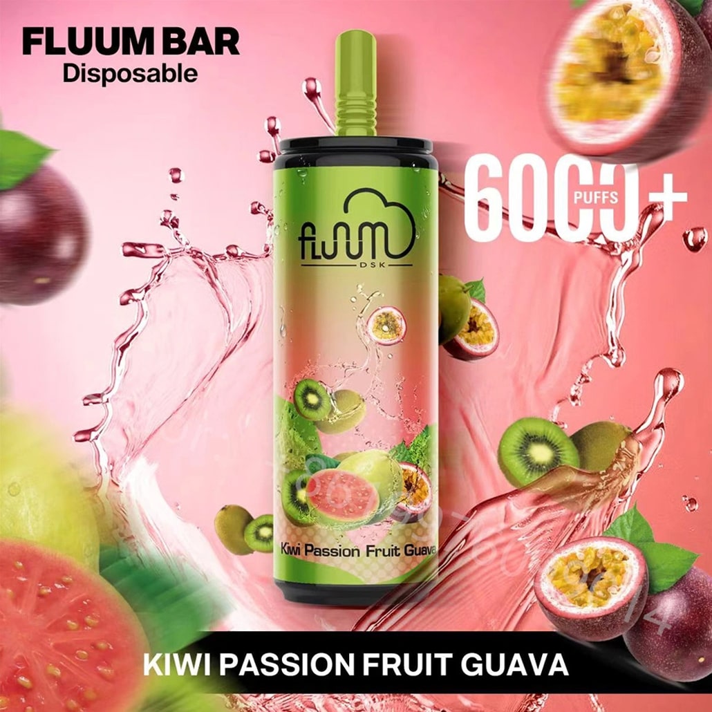 پاد یکبار مصرف FLUUM DSK 6000 PUFFS KIWI PASSION FRUIT GUAVA دارای باتری 600 میلی آمپر قابل شارژ و بدنه شاین و مخملی است.